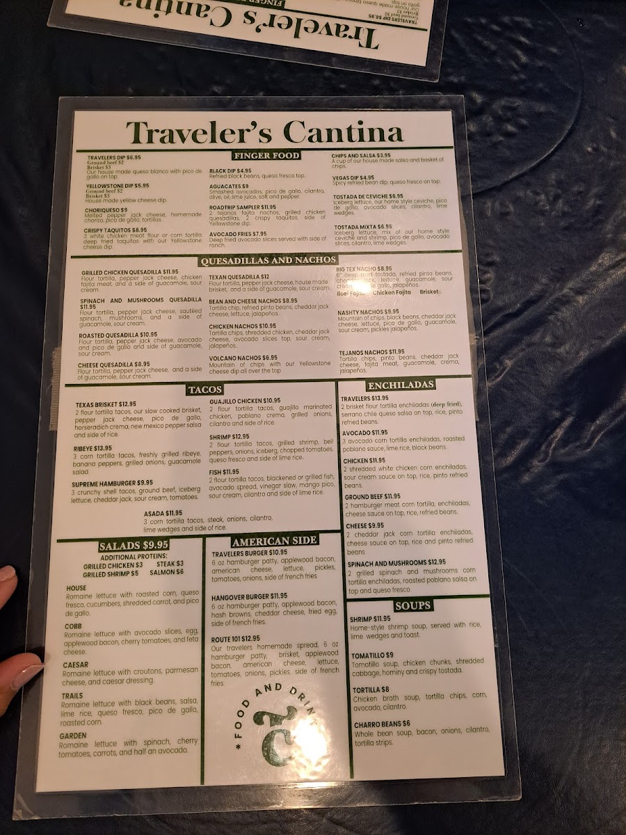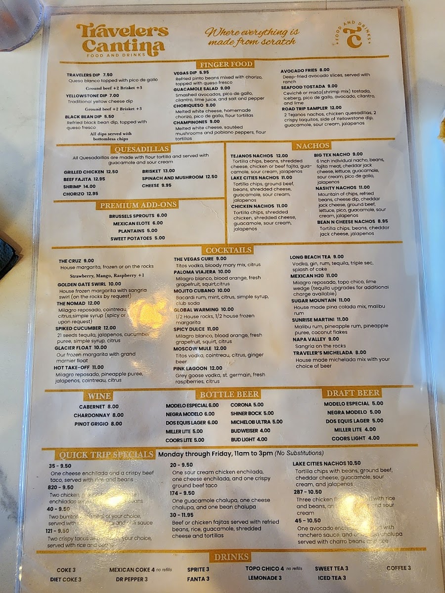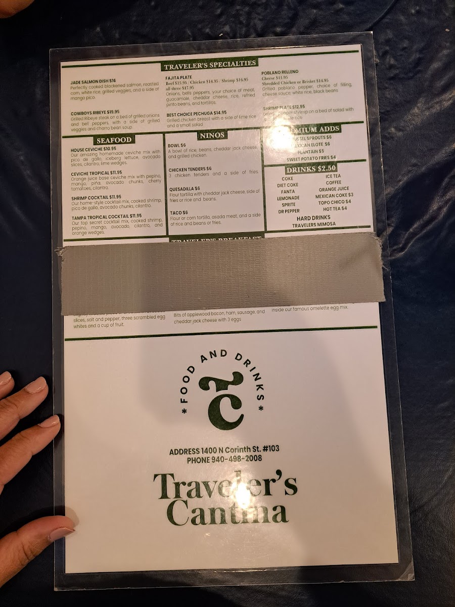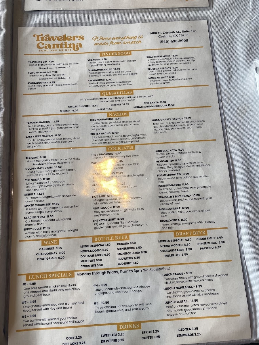 Welcome to Travelers Cantina, a vibrant dining destination located at 1400 N Corinth St, Corinth, TX. The menu celebrates the rich flavors of Mexican cuisine with an impressive variety of dishes designed to please every palate. Indulge in their Taco Salad, served in a crispy tortilla shell, or warm up with the hearty Tortilla Soup, brimming with fresh ingredients.